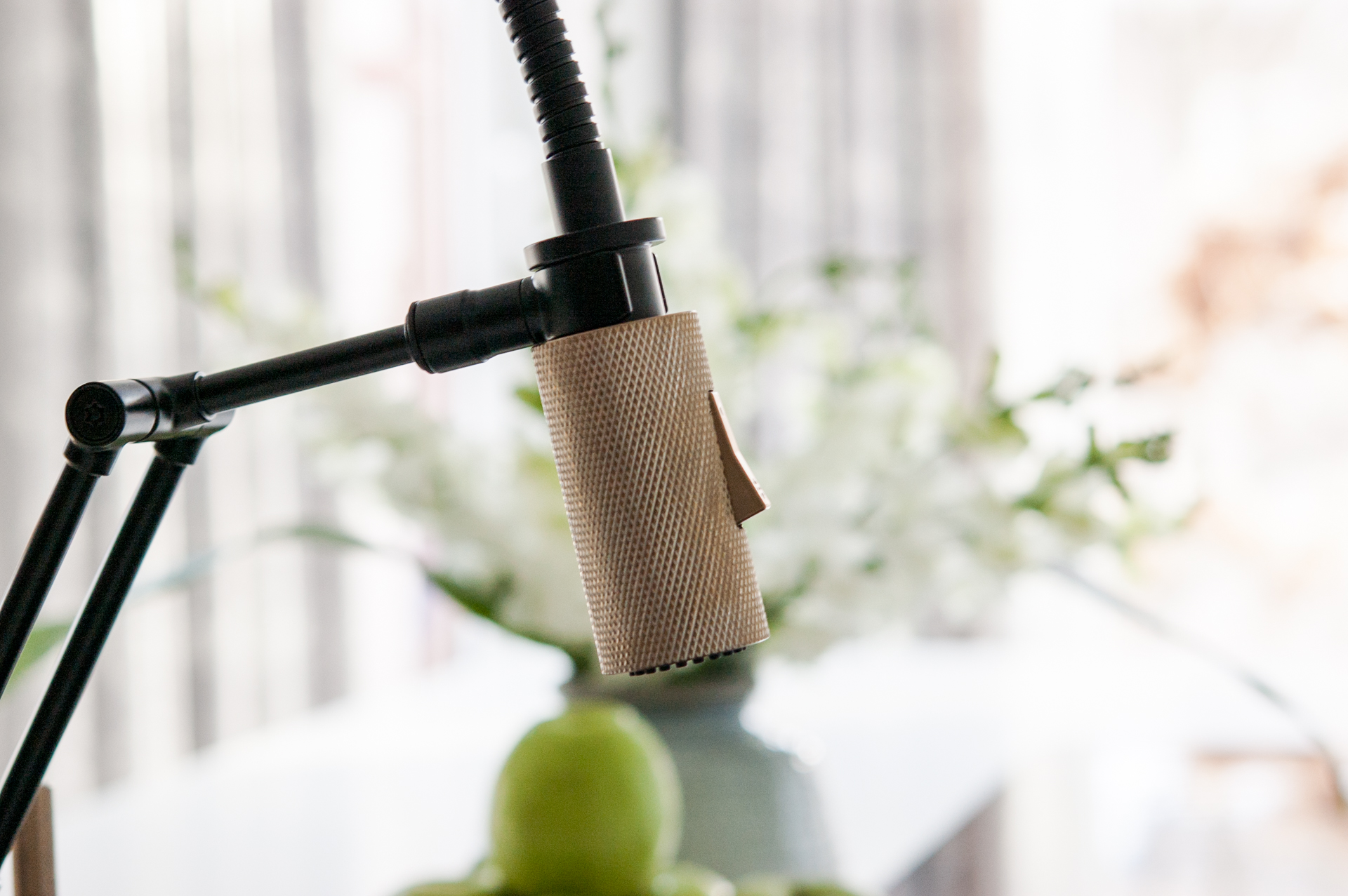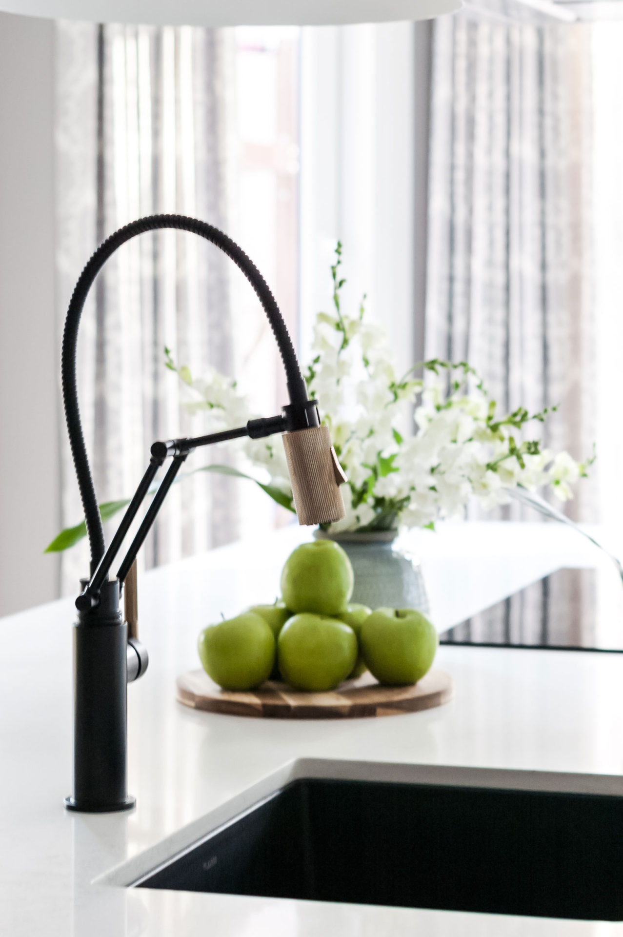 With black accents and white countertop, it felt natural to add black in the faucet and sink. Instead of the typical stainless steel, I opted for a Blanco Precis Silgranit sink in anthracite. The matte finish is stunning, and is actually more scratch resistant than stainless steel. The Brizo Litze faucet is just a work of art really. We’ve used Brizo in our past projects, and we know the quality will make this faucet last for a long time. Wanted to bring in the brass accent that is visible throughout the house, without making it take centre stage. Brizo’s brass finish is subtle, sophisticated and added just the right amount of detail to the already elegant design.