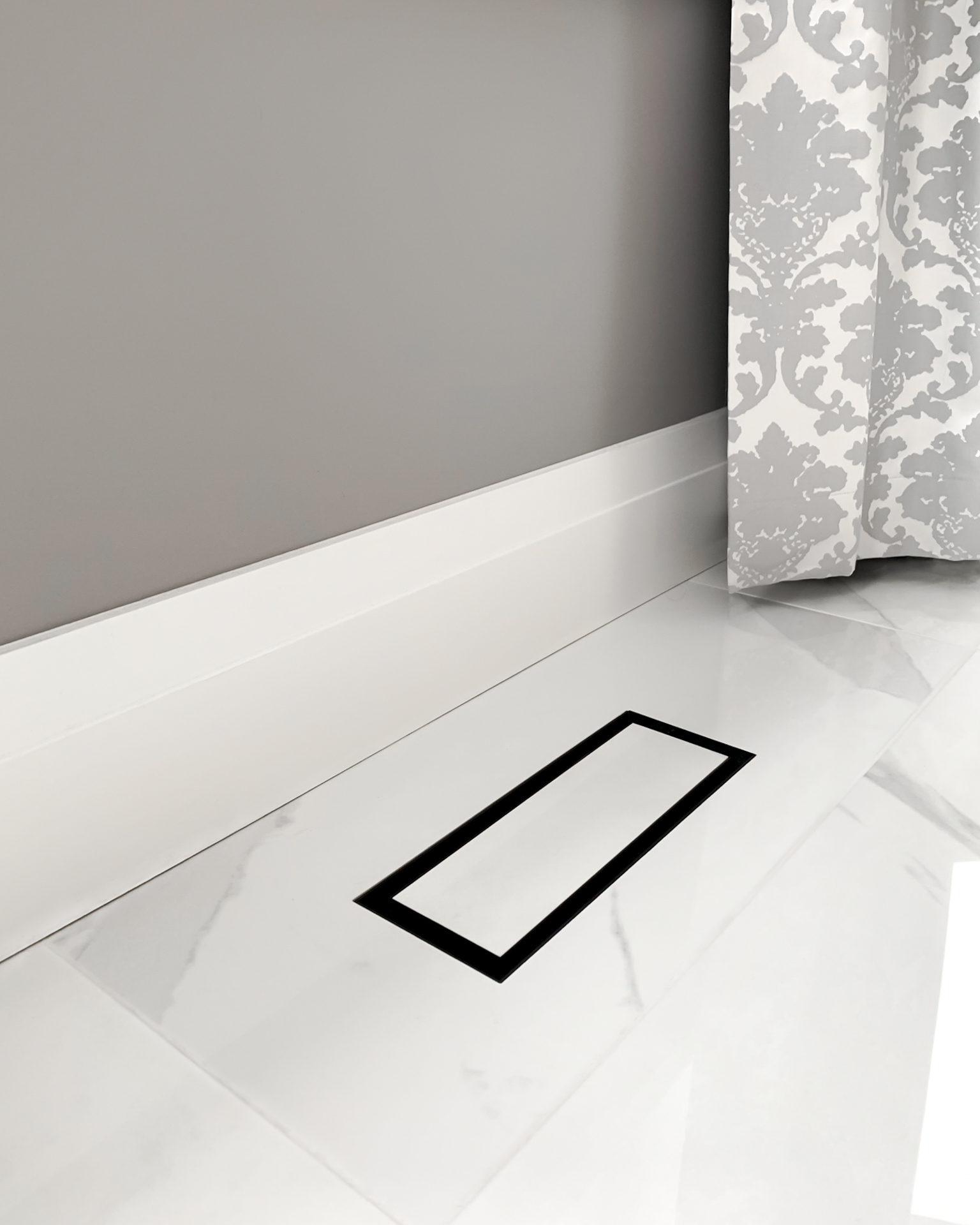 The floor uses large scale porcelain tiles. 24” x 48” is not an easy size to work with, but the scale helped create the illusion of a larger space. The glossy white tiles with minimal grout lines help create the impression of full marble slabs without the cost associated with it. The transition to the existing hardwood flooring was done using sleek black transition pieces. This allowed us to tie in together the black accents from the island to the rest of the space.